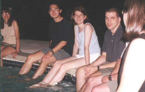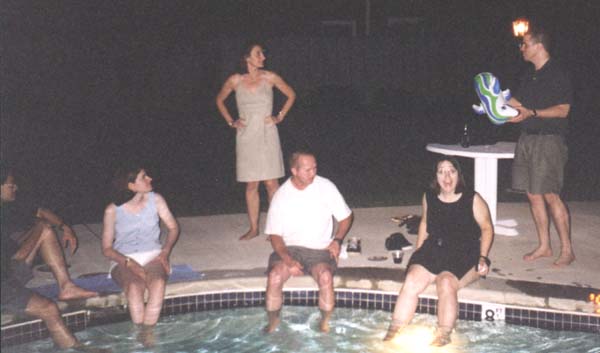 John instructs on inflatable dolphin first aid while Virginia attempts to hold the sun underwater with her feet
